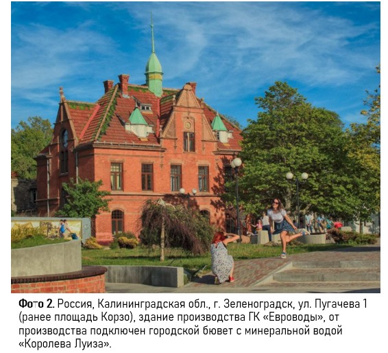 Минеральная лечебно-столовая вода «Зеленоградская» (ГК «Евроводы») – это минеральная вода с единственного сохранившегося источника со времен Восточной Пруссии, источника уникального и не имеющего аналогов (благодаря расположению на берегу Балтийского моря в месторождении формируется оптимальный состав природных соединений и микроэлементов).
